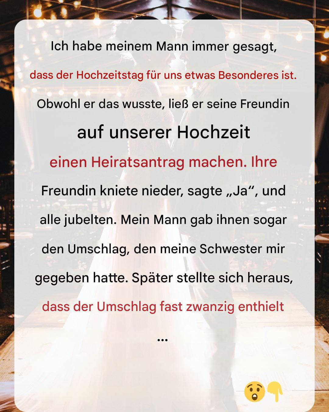 Ich habe meinem Mann immer gesagt, dass unser Hochzeitstag etwas ganz Besonderes für uns ist. Trotzdem ließ er seine Freundin auf unserer Hochzeit einen Heiratsantrag machen. Ihre Freundin ging auf die Knie, sagte „Ja“ und alle jubelten. Mein Mann gab ihnen sogar den Umschlag mit dem Geld, das mir meine Schwester gegeben hatte.