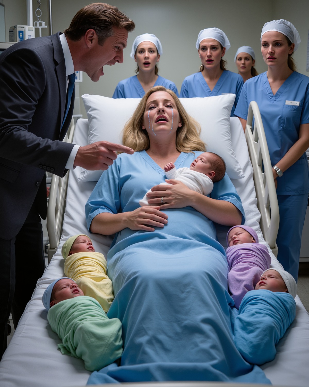 Anna lag erschöpft und zitternd nach stundenlangen Wehen da, ihre Haut feucht vom Schweiß. In ihren Armen ruhten fünf kleine Neugeborene, jedes in weiche, pastellfarbene Decken gehüllt. Drillinge hatte das Krankenhauspersonal in Erstaunen versetzt, aber Fünflinge? Sie waren unglaublich selten. Sie hätten ein Wunder sein sollen. Doch niemand im Raum betrachtete sie mit Ehrfurcht.