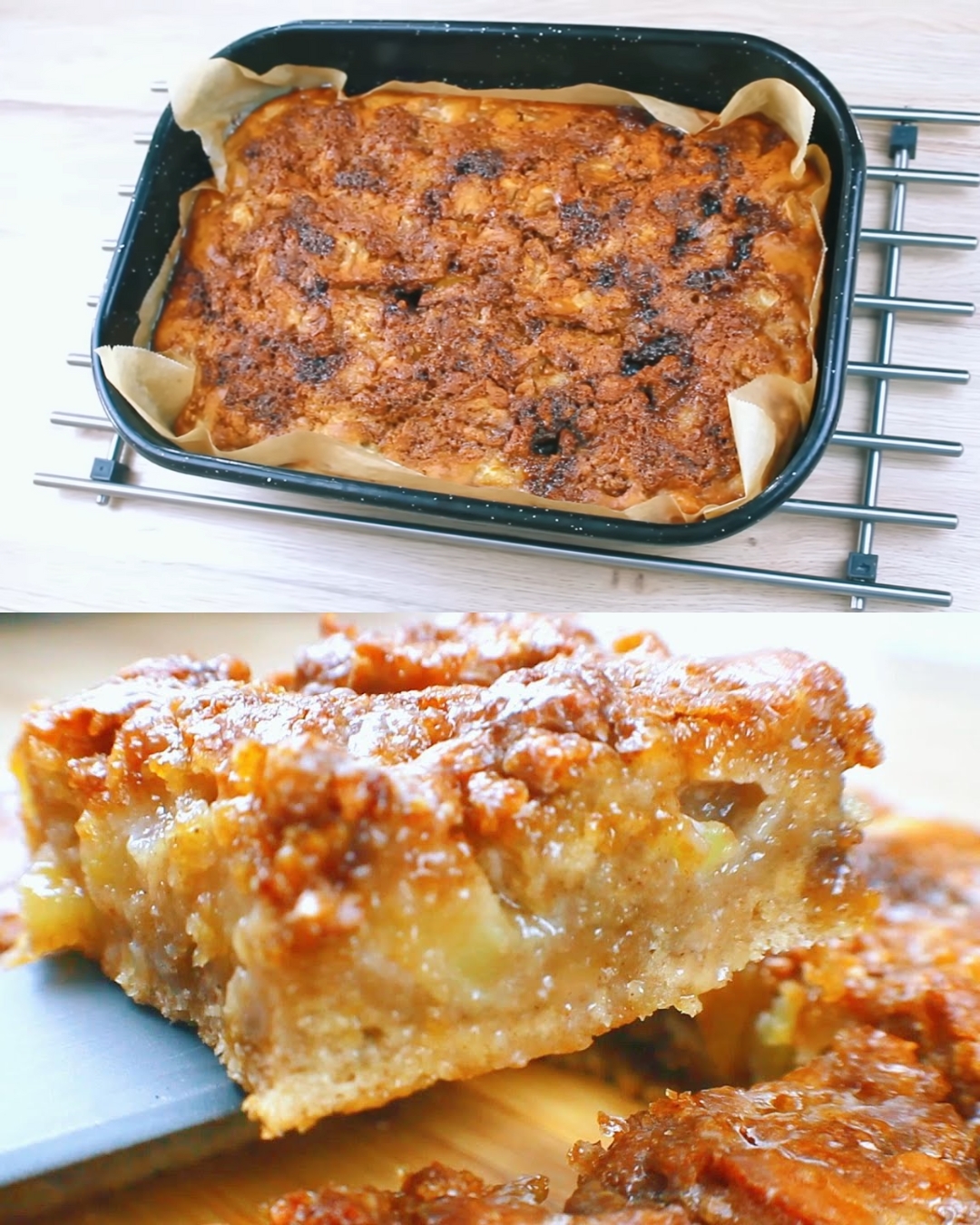 Apfelmischung zum Kuchenteig geben. Geben Sie den Teig in eine mit Backpapier ausgelegte Backform mit den Abmessungen 9 x 13 Zoll (23 cm x 33 cm).