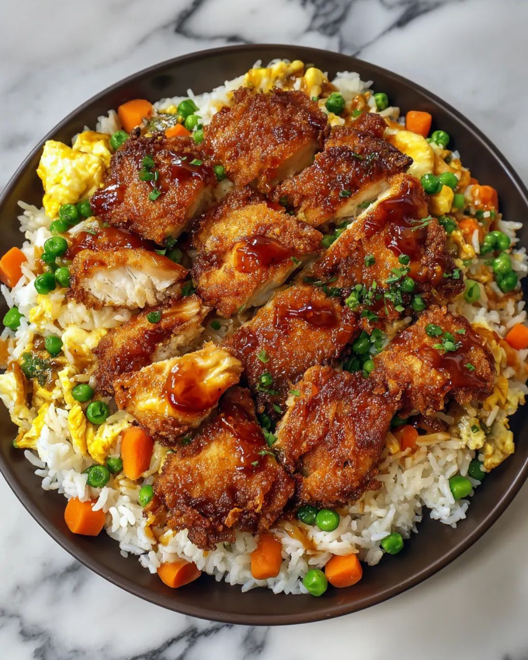 Bang Bang Chicken Fried Rice vereint zartes Hähnchenfilet, mariniert mit Paprika und Knoblauch, knusprig gegart und mit cremiger Bang Bang Sauce verfeinert. Frisches Gemüse wie Karotten, Zwiebeln und Frühlingszwiebeln, saftige Erbsen sowie sanft gerührte Eier kommen zusammen mit gebratenem Reis in die Pfanne. Ein Schuss Sesamöl, etwas Butter, Sojasauce und Zitronensaft sorgen für ein harmonisches Zusammenspiel aus Herzhaftigkeit und Frische. Über den köstlichen Reis kommt das marinierte Hähnchen mit zusätzlicher Sauce und frischen Frühlingszwiebeln. Einfach zuzubereiten und voller asiatischer Aromen – perfekt für ein geselliges Essen.