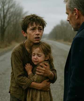 Er drehte sich um. Ein paar Schritte entfernt stand ein barfüßiger Junge, nicht älter als sechs, mit einem Kleinkind im Arm, das in einen übergroßen Kapuzenpulli gehüllt war. Ihr Gesicht war blass, ihre Lippen zitterten. Die Augen des Jungen waren vor Angst weit aufgerissen, doch seine Arme umschlossen sie schützend.