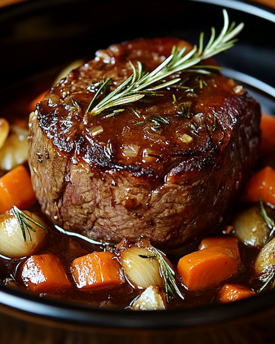 Zutaten:– 1500 g Rinderbraten– 45 ml Olivenöl– 4 Zehen Knoblauch, gehackt– 2 Zweige Rosmarin, frisch– 2 Zweige Thymian, frisch– 250 ml Rotwein– 400 g Tomaten (gehackt, aus der Dose oder frisch)– 3 Stück Karotten, in Scheiben– 2 Stück Zwiebeln, grob gehackt– Salz und Pfeffer nach GeschmackAnleitung: siehe Fortsetzung auf der nächsten Seite