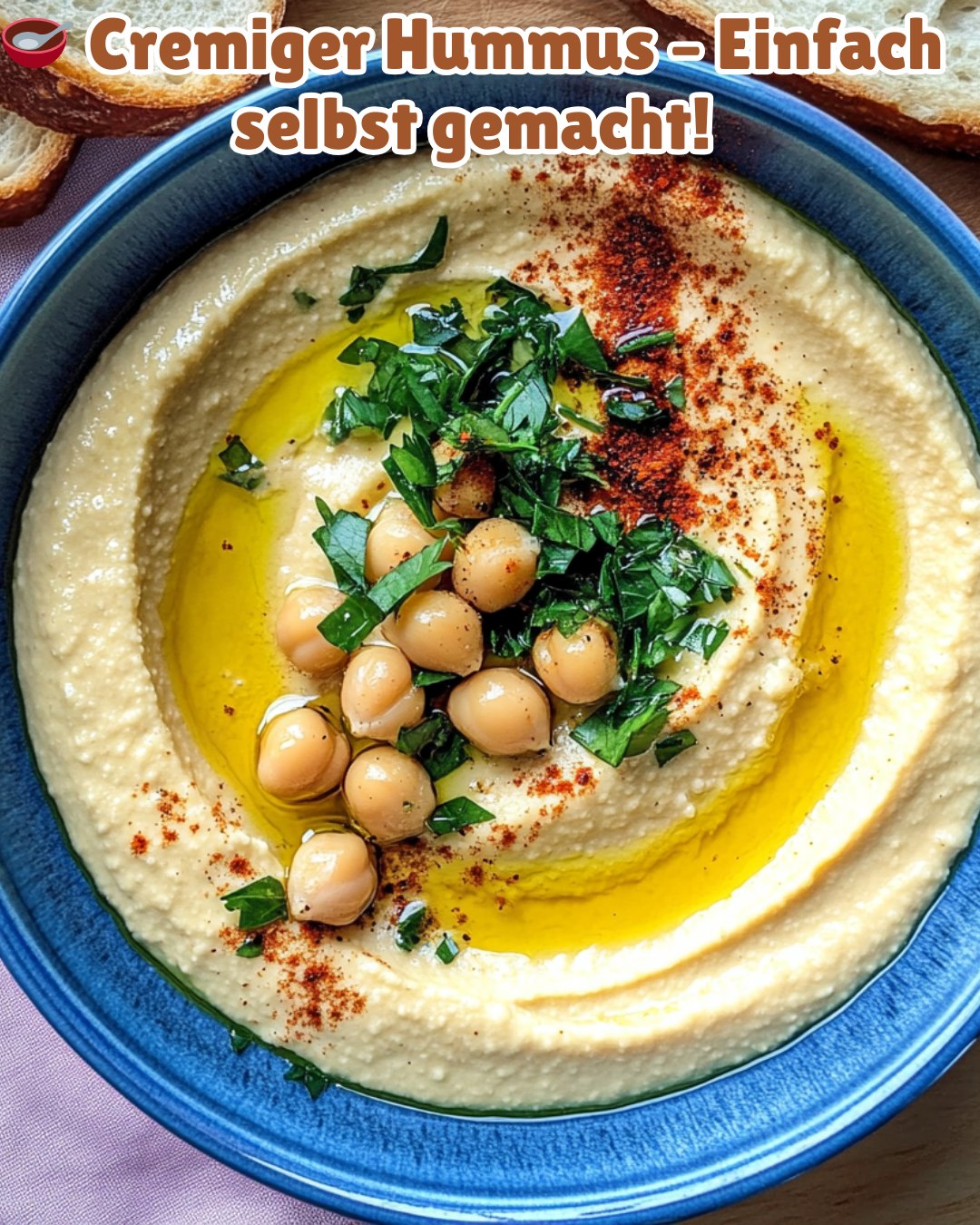 Cremiger Hummus aus Kichererbsen, Sesammus und Zitronensaft – ein perfekter Dip für Brot und Gemüse! Zutaten (für 4 Personen):