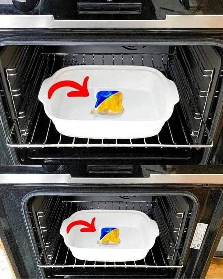 Dankzij de ontvettende en ontsmettende eigenschappen blijven vaatwastabletten een effectieve reinigingsoplossing voor de oven. Om van de vele voordelen te profiteren, plaats je eenvoudigweg een capsule op een bakplaat of hittebestendige schaal.