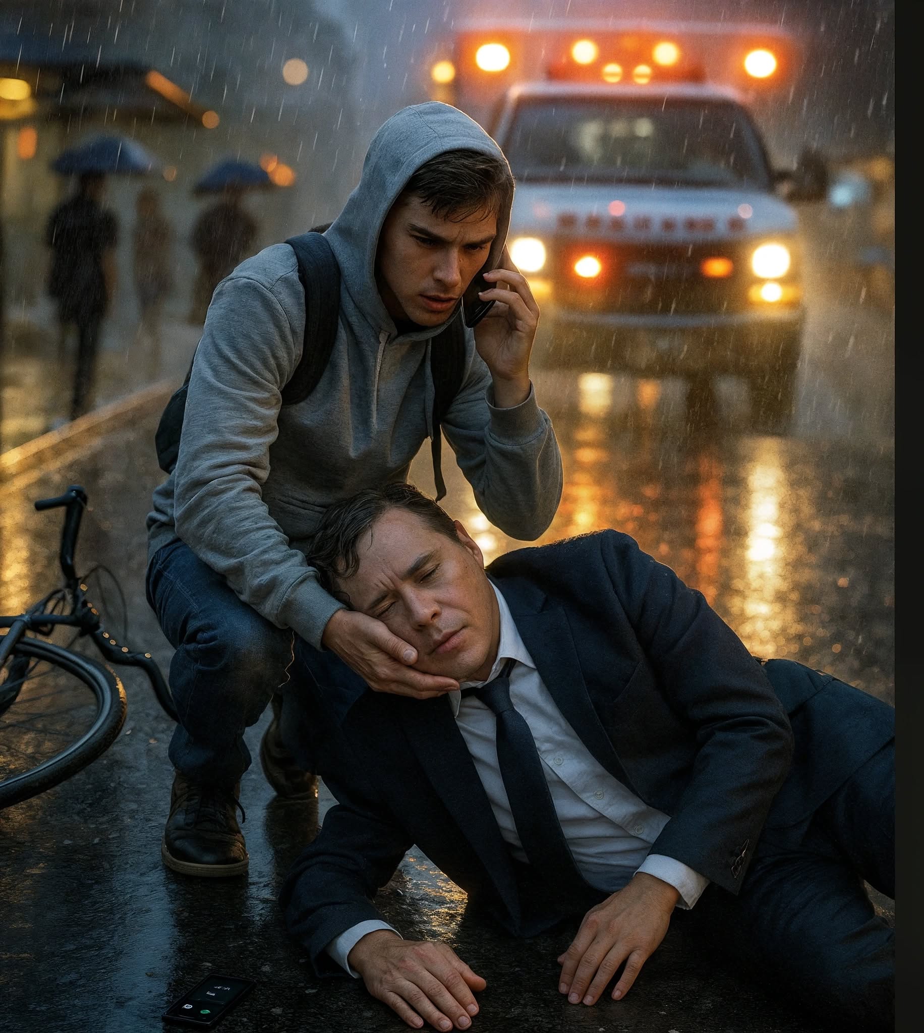 Ein Mann im dunkelblauen Anzug lag zusammengebrochen neben einer Bushaltestelle, das Gesicht zum Bürgersteig gewandt. Hastige Passanten warfen ihm einen Blick zu und gingen dann weiter. Ethan verlangsamte seinen Schritt – nur für einen Augenblick – die Prüfung, seine Zukunft, alles lastete schwer auf ihm. Sein Gewissen ließ ihn nicht weitergehen.