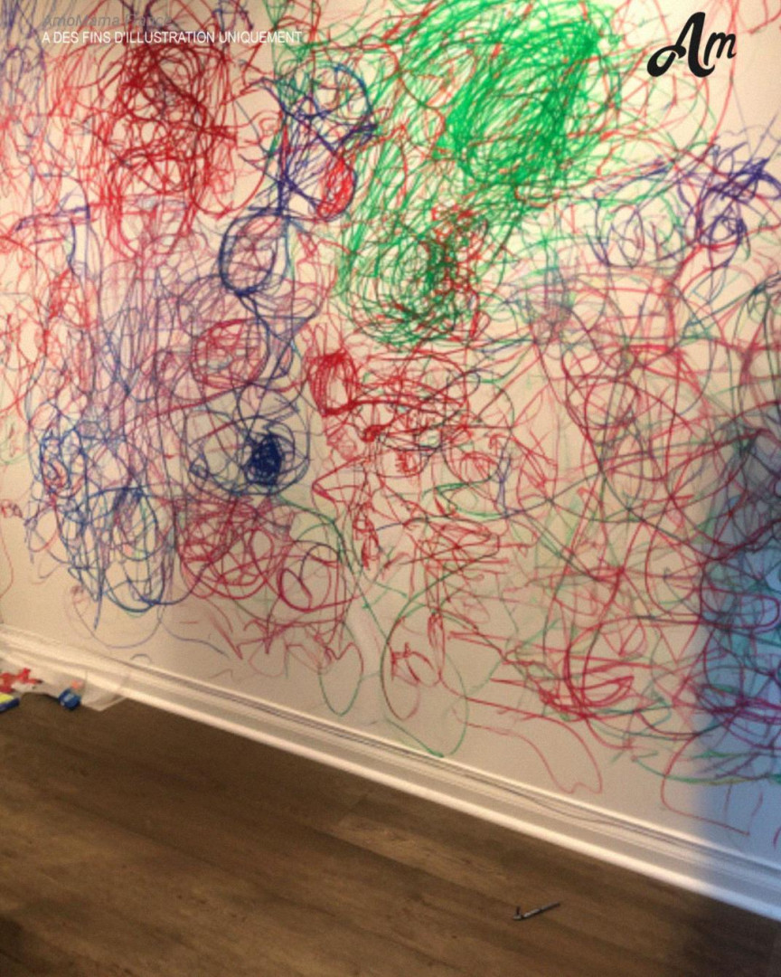 Ich schnappte nach Luft. Da, auf unserer brandneuen Tapete, waren Wirbel aus roten, blauen und grünen Filzstiften, in Schleifen und Zickzacklinien, die sich vom Boden bis zu meiner Taille erstreckten. Die Stiftkappen waren wie Konfetti über den Teppich verstreut. Mir wurde ganz schlecht.