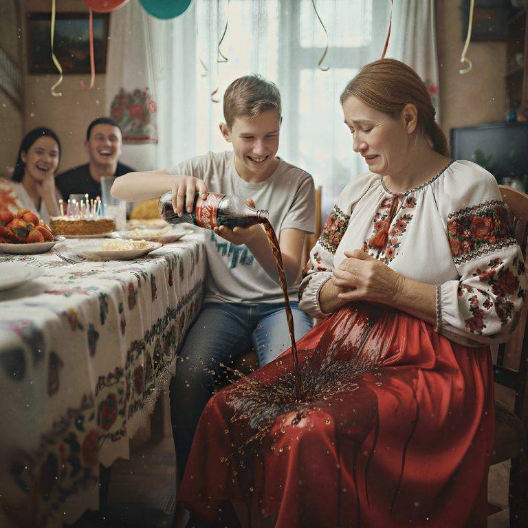 Bei einem Familienessen zu Oma Galas Geburtstag in der Wohnung meines Bruders kam sein 14-jähriger Sohn Artem mit einem vollen Glas Cola auf mich zu und schüttete mir den Inhalt direkt in den Schoß. „Oma sagt, du solltest nicht hier sein“, rief er und sah mir dabei in die Augen. Am Tisch brach schallendes Gelächter aus. Ich wischte mir den Rock mit Servietten ab, zwang mich zu einem Lächeln und sagte nichts.
