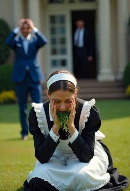 Dort, am Rand des Rasens, hockte seine Zofe. Sie jätete kein Unkraut und arrangierte auch keine Blumen. Sie kaute auf etwas herum.