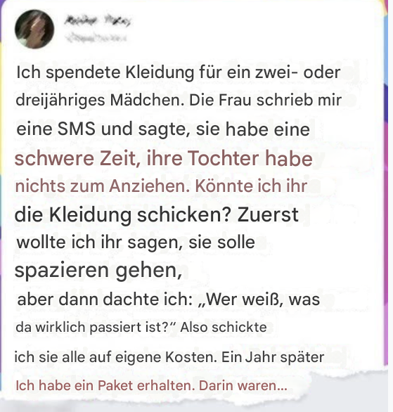 Ich dachte darüber nach, wie schwierig es ist, um Hilfe zu bitten, besonders wenn man am Tiefpunkt ist. Also packte ich die Kleidung, bezahlte den Versand selbst und schickte sie los, ohne eine Antwort zu erwarten.