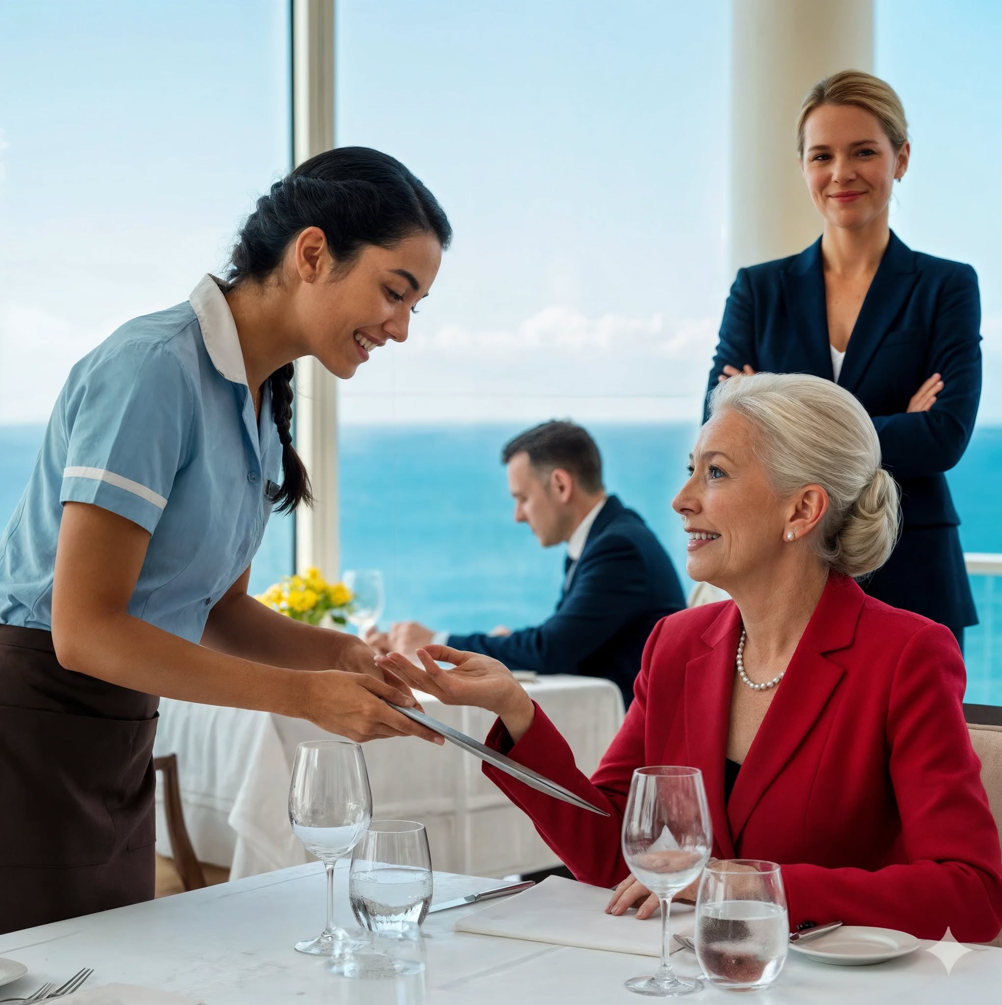 Ihre grünen Augen musterten das Restaurant mit einer Mischung aus Neugier und etwas, das Elena sofort erkannte: Einsamkeit. Frau Herrera eilte zum Ehrentisch. „Herr Valdés, welch eine Ehre! Wir haben unseren besten Tisch gedeckt.“ Julián nickte und führte seine Mutter, doch Elena bemerkte etwas: Carmen war völlig abwesend. Der Tisch geht zu großen Fenstern mit Meerblick hinaus. Frau Herrera wies Elena an: „Kümmere dich gut um Herrn Valdés’ Tisch, und wehe dir, wenn du den kleinsten Fehler machst: Morgen bist du raus.“