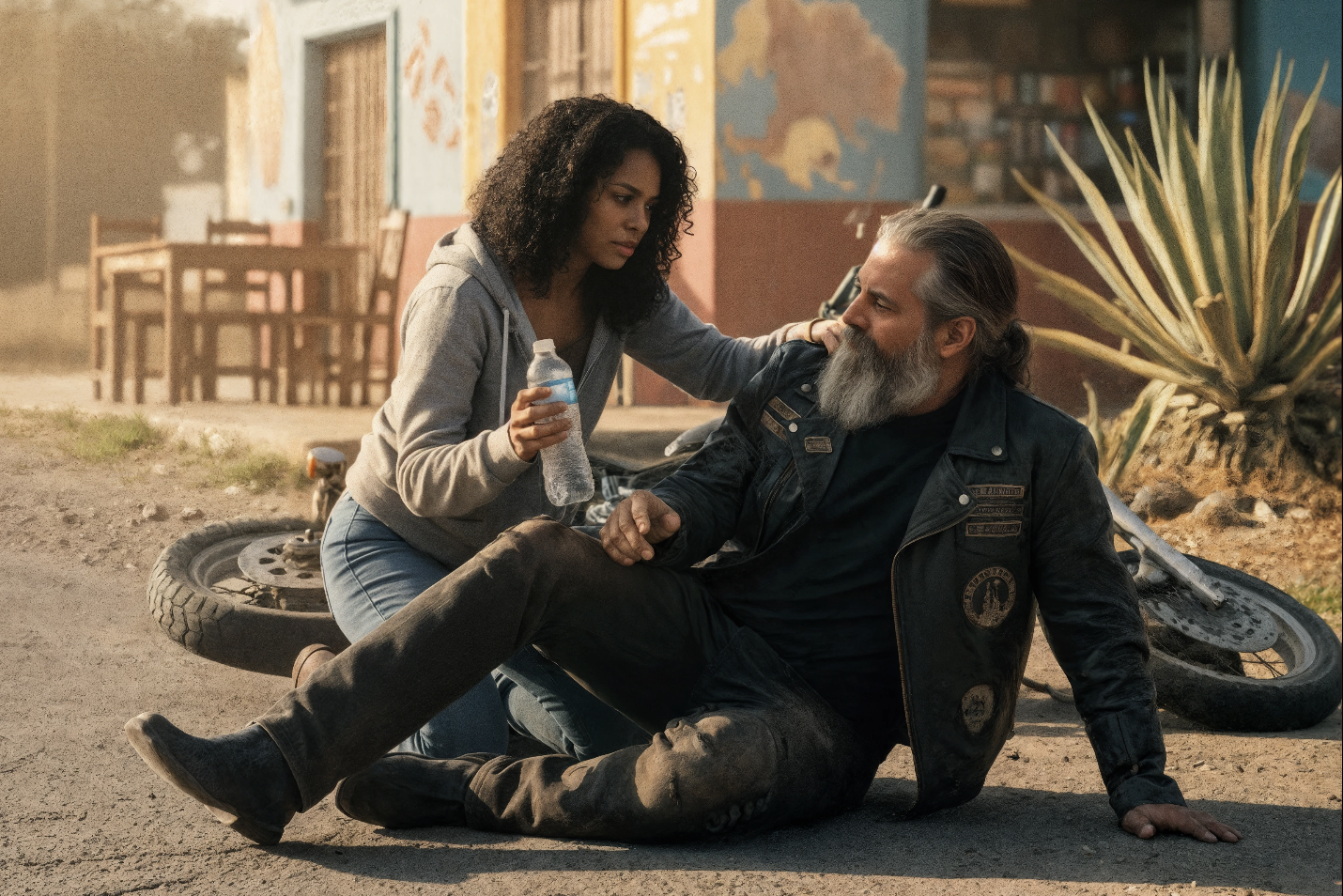 Ein Mann lag auf dem Asphalt, sein massiger Körper zitterte neben einem glänzenden Motorrad. Er atmete schwer, eine Hand drückte gegen seine Brust.