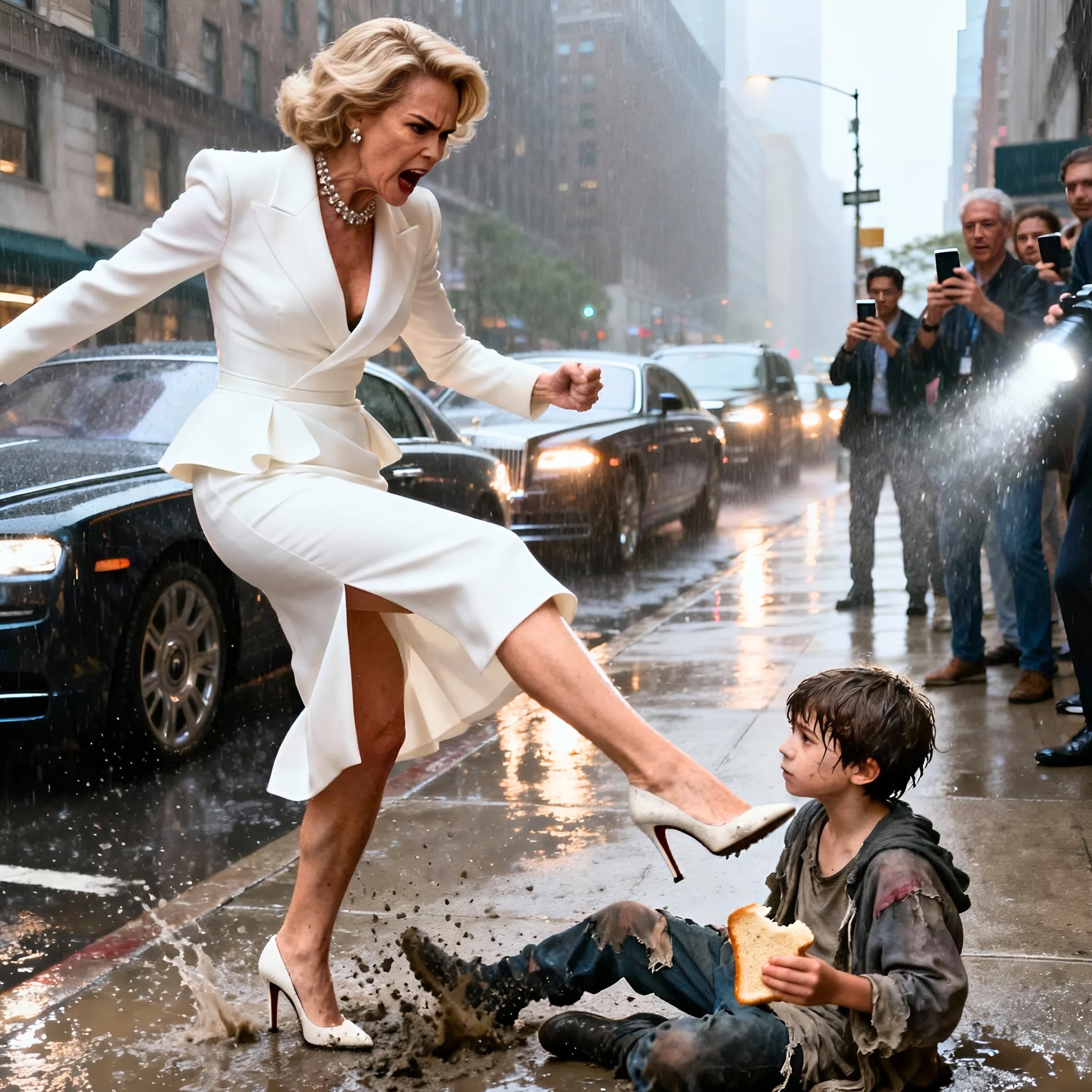 Auf dem Bürgersteig rannte eine Gruppe Kinder durch den Regen. Einer von ihnen, ein dünner Junge in alten Kleidern, stolperte und rannte versehentlich mit ihr zusammen , wobei sein Seidenmantel mit Schlamm bespritzt wurde.