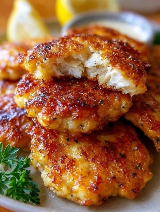 8. Servieren Sie die käsigen Hähnchenstücke heiß mit Ihrer Lieblings-Dip-Sauce.