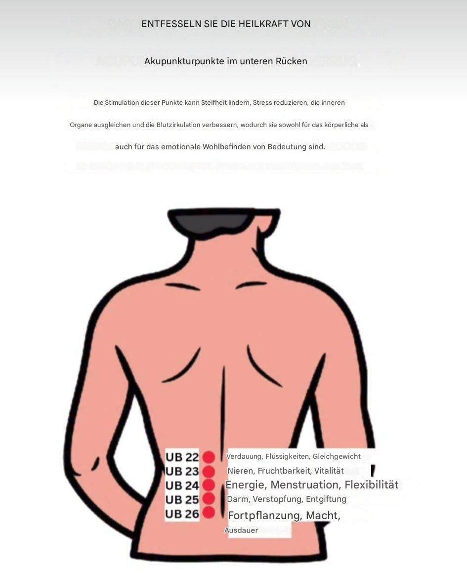 Der untere Rücken bildet nicht nur die Grundlage unserer Wirbelsäule und Körperhaltung, sondern kontrolliert auch wichtige Meridiane, die mit Nieren, Darm und Geschlechtsorganen verbunden sind. Die Stimulation dieser Punkte kann Verspannungen lösen, die Durchblutung verbessern und die Organe ins Gleichgewicht bringen. Dies führt nicht nur zu körperlicher, sondern auch zu emotionaler Entspannung.