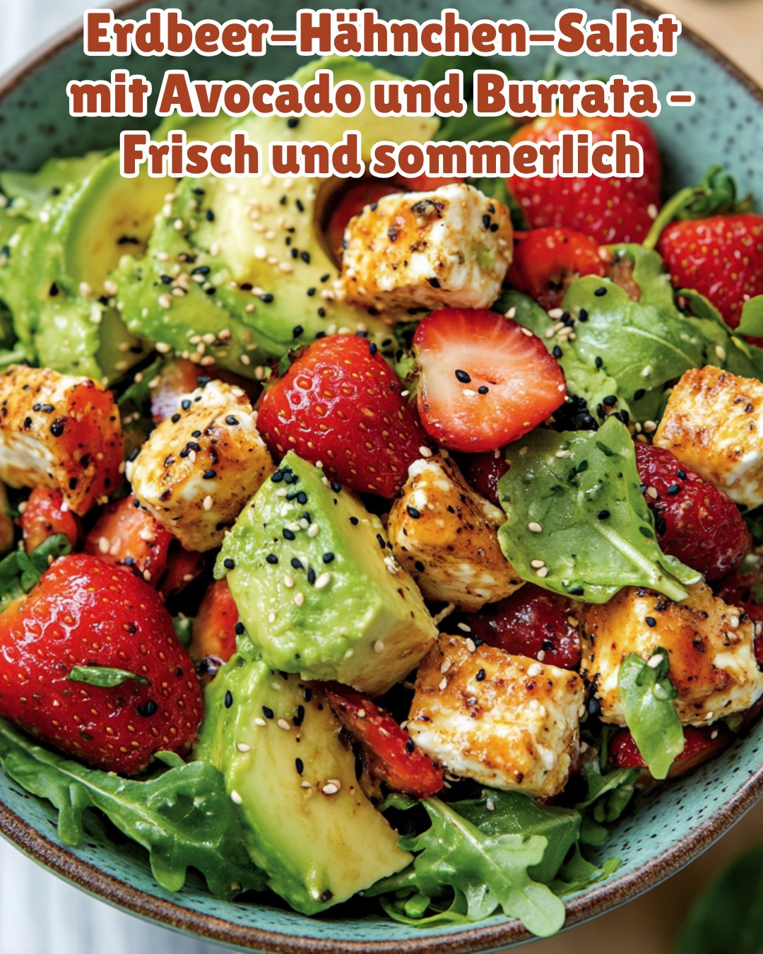 Ein frischer Sommersalat mit süßen Erdbeeren, zartem Hähnchen, cremiger Burrata und einem leckeren Dressing.