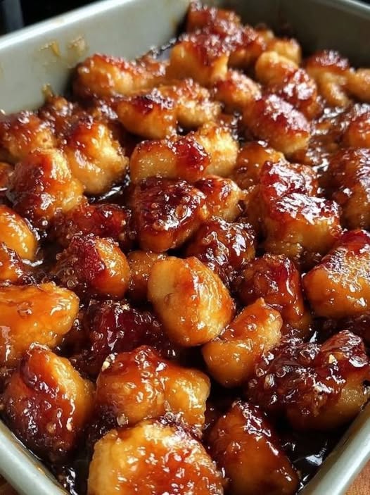 Genießen Sie das hausgemachte, gebackene süß-saure Hähnchen mit Reis oder Gemüse.