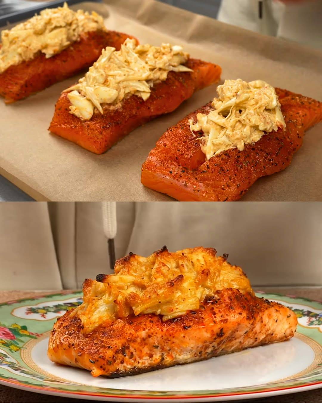 Dieser gefüllte Lachs mit Krabbenfleisch ist ein elegantes und dennoch einfach zuzubereitendes Gericht, das sich perfekt für ein besonderes Abendessen oder ein festliches Mahl eignet. Der reichhaltige, zarte Lachs ist mit einer aromatischen Krabbenmischung gefüllt, mit Gewürzen abgeschmeckt und mit einer buttrigen Kräutersauce übergossen, die alles perfekt abrundet. Dieses Rezept vereint den delikaten Geschmack von Lachs mit der Süße von Krabben und sorgt so für ein köstliches, verführerisches Gericht. Egal, ob Sie für die Familie kochen oder Gäste bewirten, dieses Gericht wird Sie begeistern.