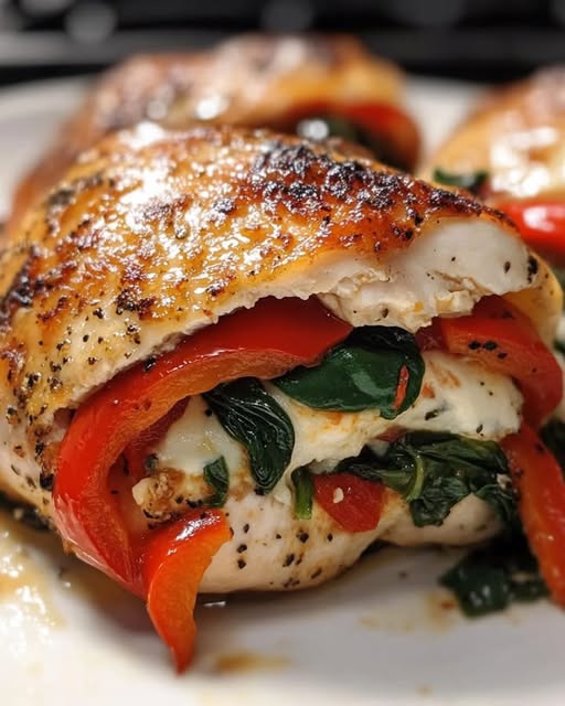 Gefülltes Hähnchen mit geröstetem roten Paprika, Spinat und Mozzarella