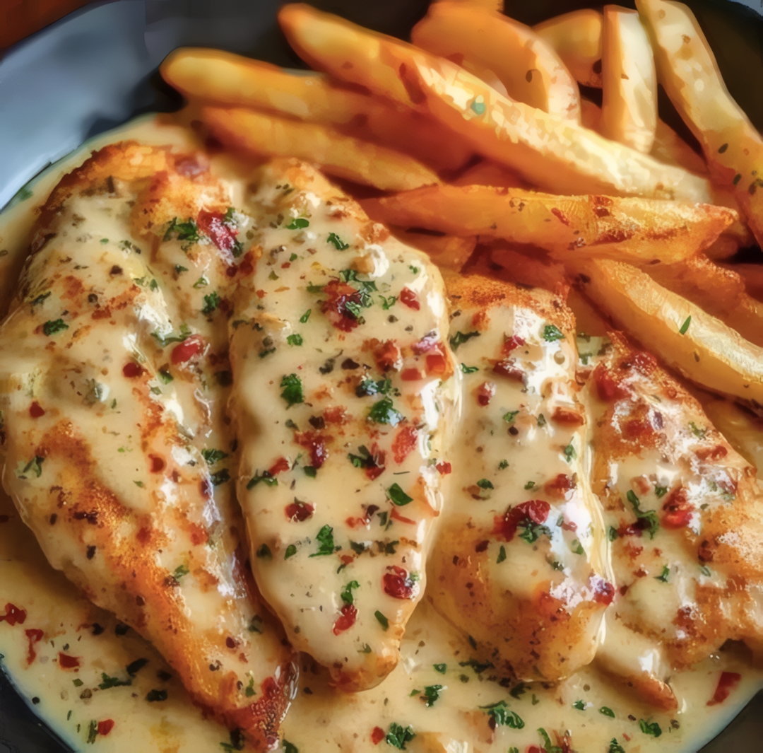 Hähnchenfilet in würziger, cremiger Knoblauch-Parmesan-Sauce mit Pommes Frites