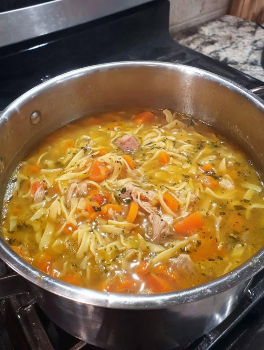- Würzen und köcheln lassen: Lorbeerblatt, getrockneten Thymian, getrocknete Petersilie, Salz und Pfeffer hinzufügen. Die Hitze auf mittlerer Stufe reduzieren und die Suppe etwa 20–25 Minuten köcheln lassen, oder bis das Huhn gar und das Gemüse weich ist.