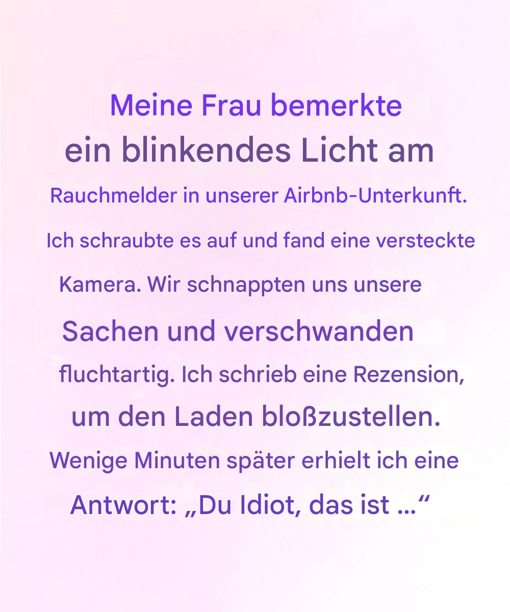 Bei einer Kamera in Ihrem Airbnb ist dies jedoch nicht der Fall. In unserer Zeit kann die Sicherheit in der modernen Welt der Freizeitgestaltung, der Hausüberwachungssysteme und der digitalen Kommunikation gewährleistet sein. Obwohl ich zu Hause war, musste mein kleiner Hund nicht mit neuer Technologie geweckt werden, aber es wurde gesagt, dass es einen Weckruf gab: Er hatte keine Chance.