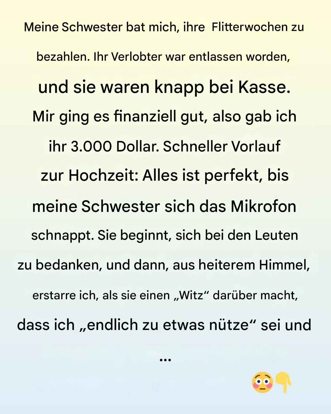 Schneller Vorlauf zum Hochzeitsempfang; alles ist perfekt, bis meine Schwester das Mikrofon ergreift. Sie beginnt, sich bei den Leuten zu bedanken, und dann, aus heiterem Himmel, erstarre ich, als sie einen „Witz“ darüber macht, dass ich „endlich zu etwas nütze“ sei und „mir die Hochzeit erkauft habe, indem ich die Flitterwochen finanziert habe“.