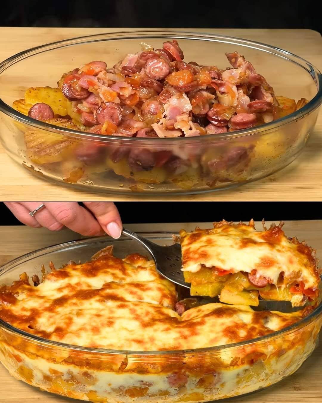 Diese Kartoffel-, Wurst- und Käsepfanne ist ein herzhaftes und aromatisches Gericht mit knusprigen Kartoffeln, herzhaften Würstchen und geschmolzenem Käse. Perfekt für eine sättigende Mahlzeit zu jeder Tageszeit – garantiert ein Familienliebling.