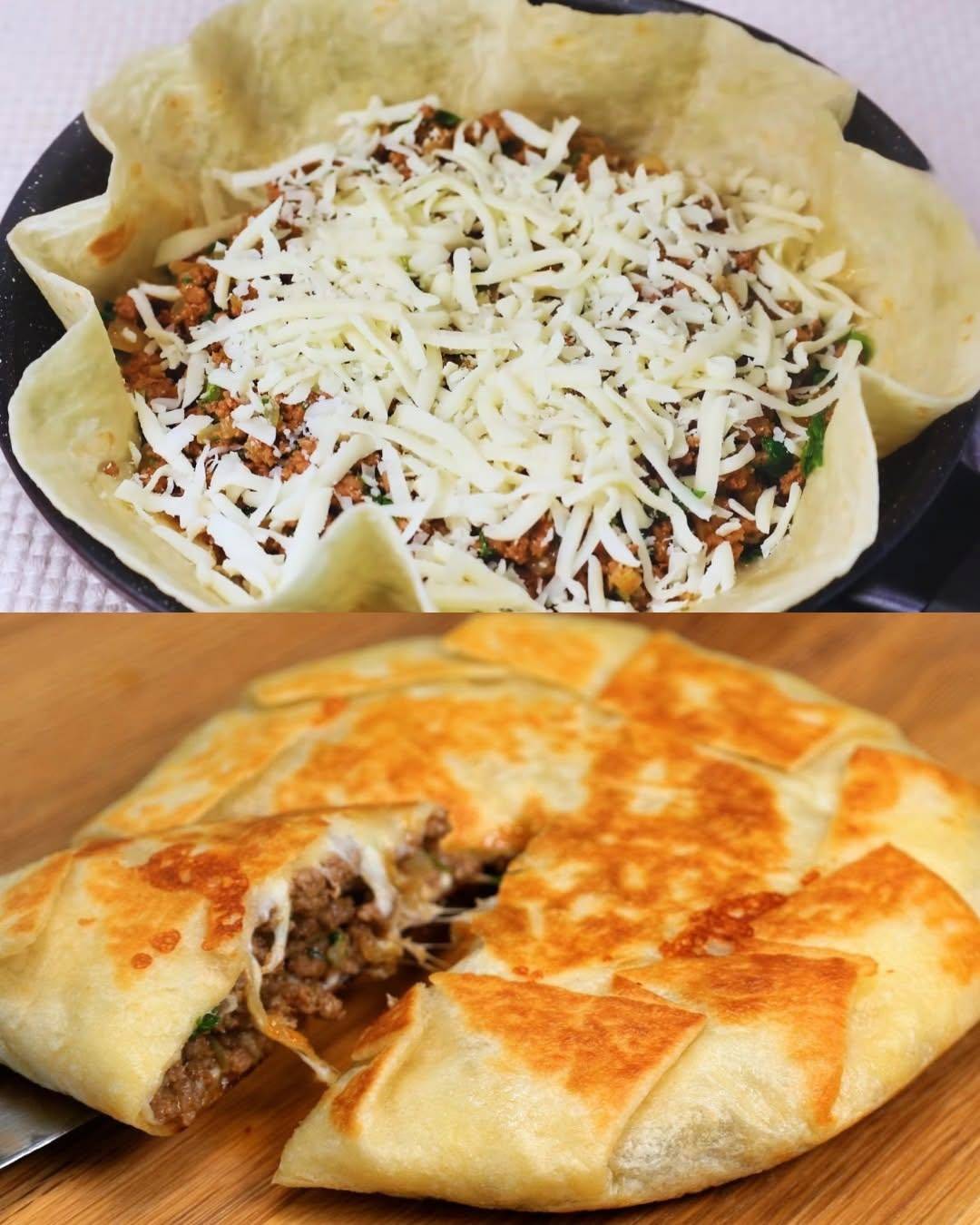 Diese Käse-Rindfleisch-Tortilla ist ein köstliches und einfach zuzubereitendes Gericht, perfekt zum Mittag- oder Abendessen. Die knusprige Tortilla ist mit gewürztem Rinderhackfleisch, geschmolzenem Mozzarella und frischen Kräutern gefüllt. So genießen Sie eine schnelle, sättigende Mahlzeit mit wenigen Zutaten.