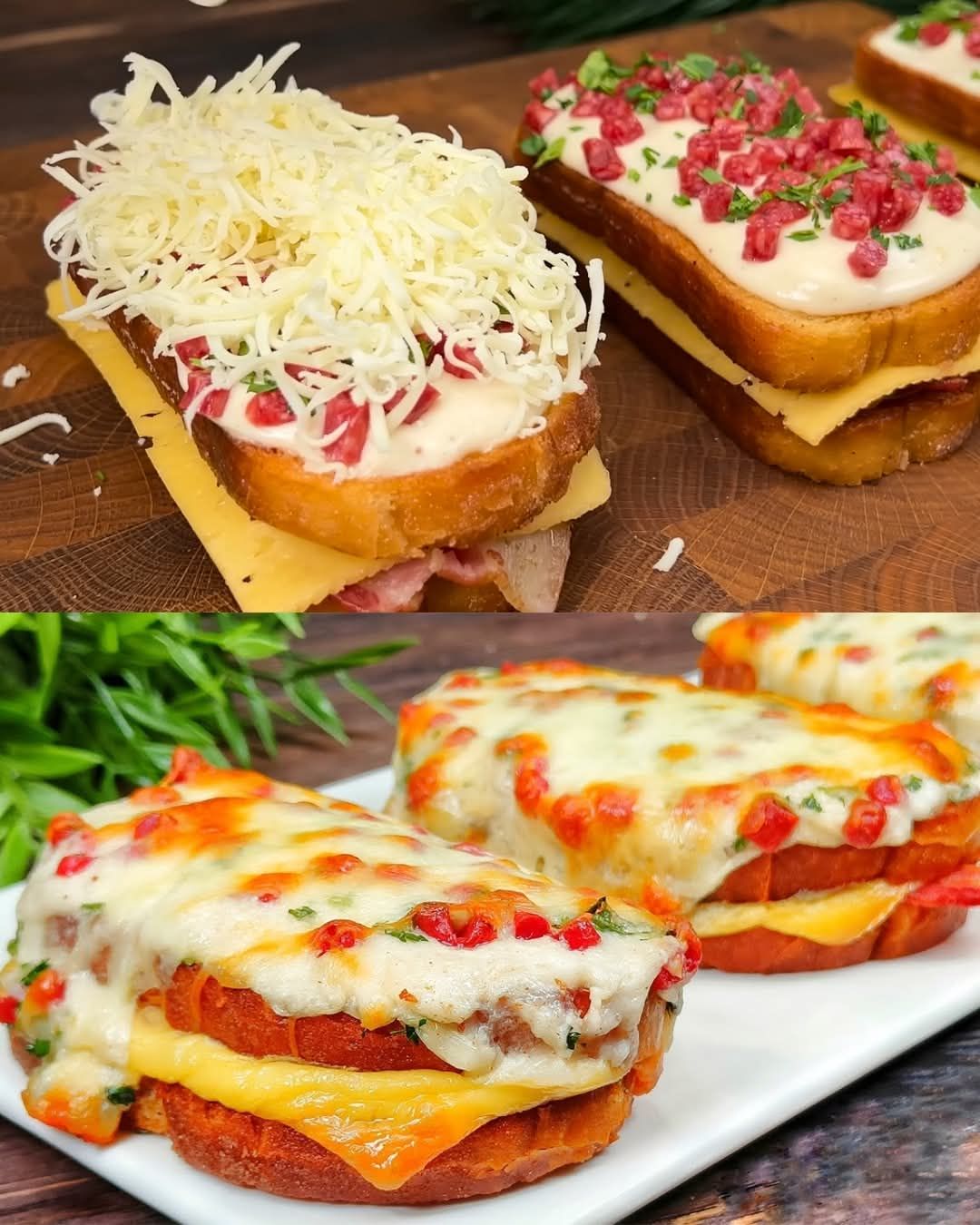- Legen Sie auf jede Brotscheibe eine Scheibe Käse und eine Scheibe gebratenen Speck.