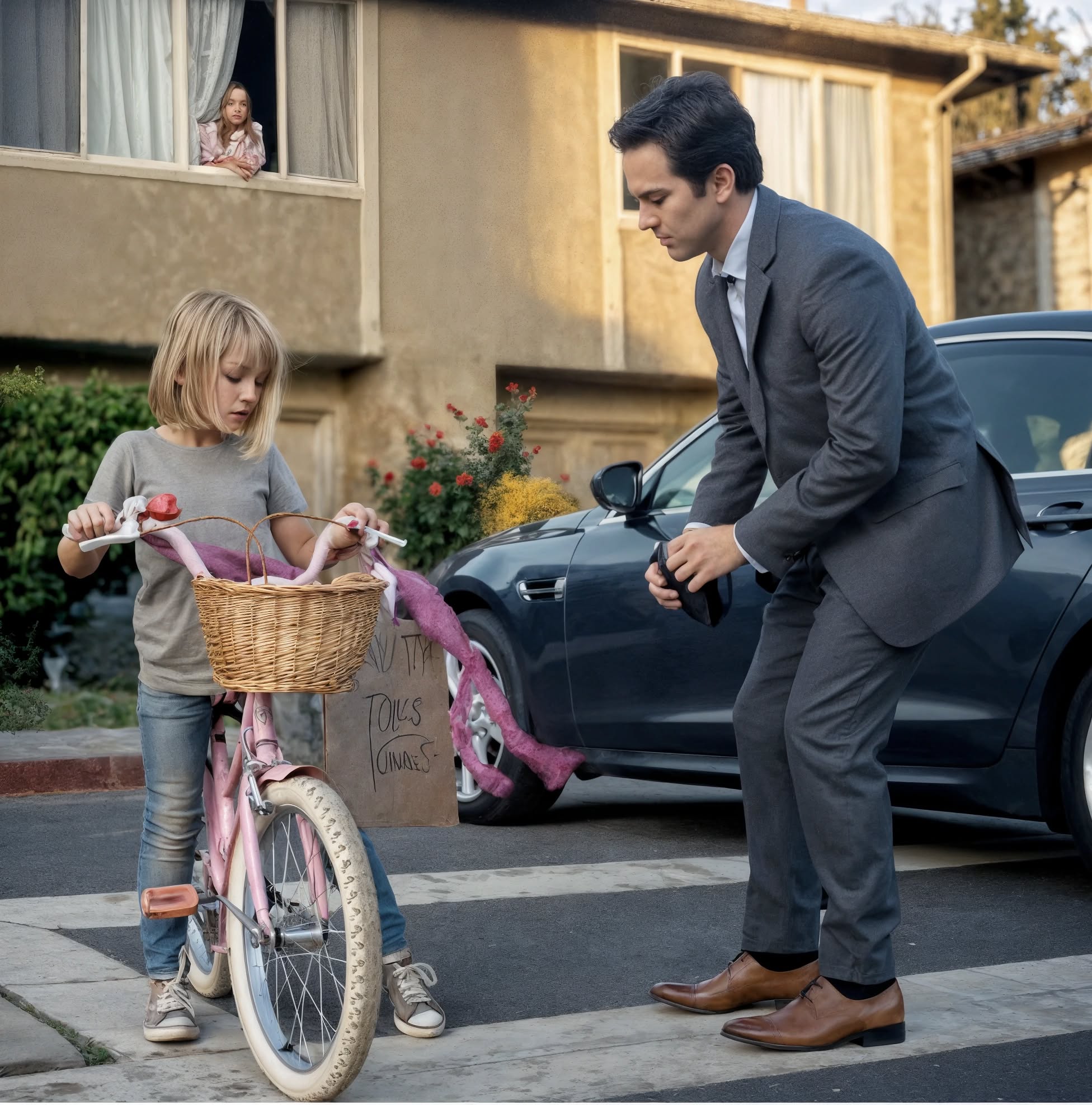 Die Worte entfuhren den Lippen eines siebenjährigen blonden Mädchens, dessen kleine Hände zitterten, während sie ein selbstgebasteltes Pappschild hielt. Arthur Stribbling, ein millionenschwerer CEO, hatte seinen luxuriösen BMW geparkt, nachdem er eine unglaubliche Szene beobachtet hatte: ein Kind, das an einer Straßenecke in Fresno sein pinkfarbenes Fahrrad verkaufte.