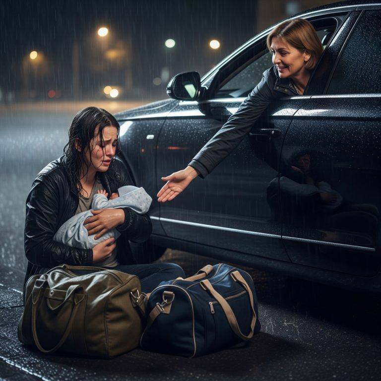 Der Regen prasselte in Strömen herab und durchnässte meinen dünnen Mantel, während ich mit meinem neugeborenen Sohn im Arm auf der Veranda saß. Zu meinen Füßen lagen zwei Reisetaschen voller Flaschen, Windeln und ein paar Kleidungsstücke. Es war alles, was mir von meiner Ehe geblieben war.