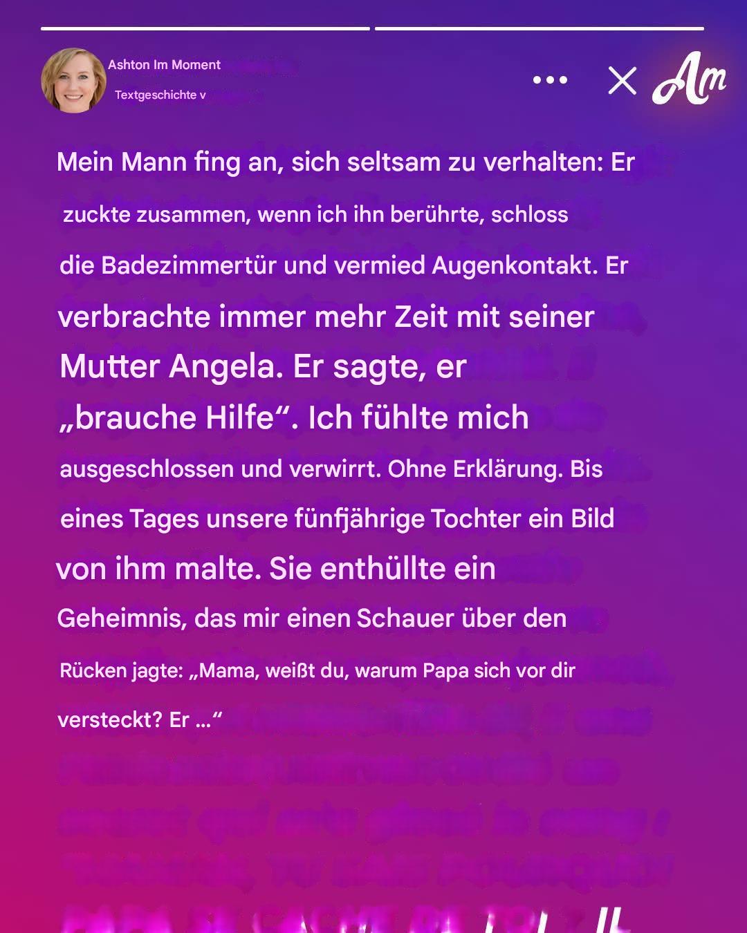 Mein Mann begann sich seltsam zu verhalten. Er zuckte zusammen, wenn ich ihn berührte, schloss die Badezimmertür und vermied Augenkontakt. Er verbrachte immer mehr Zeit mit seiner Mutter und sagte, er brauche Hilfe.
