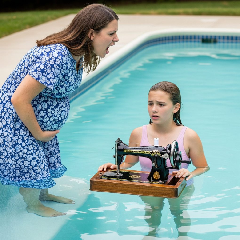 Das Geräusch von etwas Schwerem, das in den Pool fällt, durchschnitt die Nachmittagsstille wie ein Schuss. Einen Moment lang dachte ich, vielleicht sei ein Stuhl ins Wasser gefallen oder einer der Hunde einem Ball hinterhergesprungen. Dann sah ich es – eine rosa-weiße Nähmaschine, die langsam ins Wasser sank. Blasen stiegen auf, als das Licht auf die metallische Stichplatte fiel. Meine Tochter Lily schrie.
