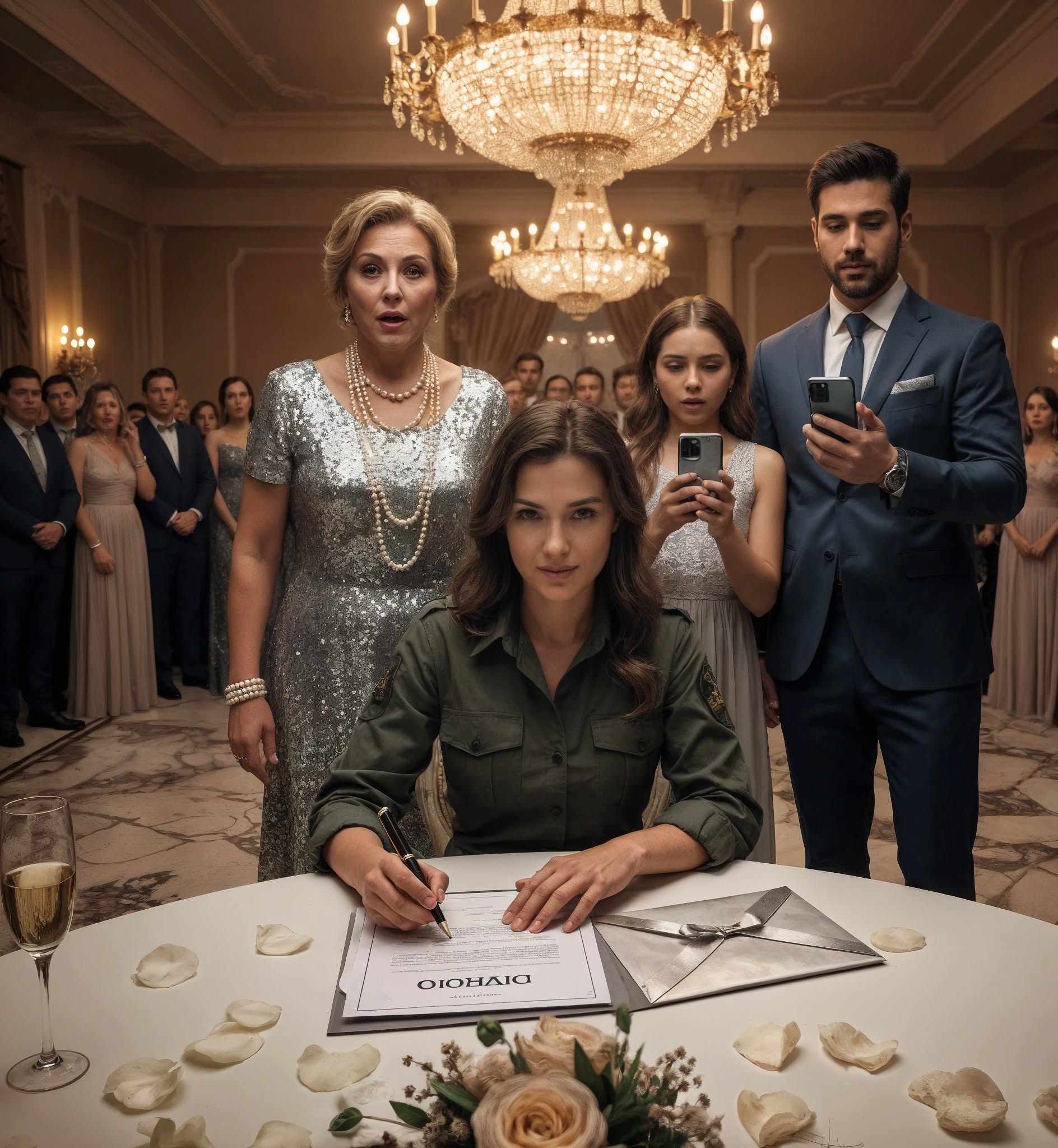 Mein Mann Mark stand neben mir, das Handy zum Filmen hochgehalten. Seine Schwester Olivia neigte ebenfalls zu ihrer Kamera, ihr Lächeln war so strahlend, dass es Kristall hätte durchschneiden können. Ich nahm den Umschlag, mein Herz hämmerte wie wild. Die silbernen Buchstaben glitzerten im Kronleuchter, als ich meinen Finger unter die Lasche schob. Das Papier riss. Kein freundliches Wort, kein Segen, nicht einmal ein Scheck. Scheidungspapiere. Die Worte sprangen mir entgegen, fett und deutlich, jeder Buchstabe schwerer als das Metall meines Uniformabzeichens.