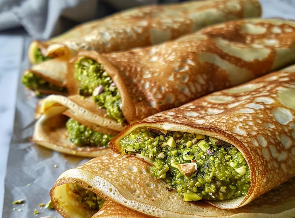 Diese Crêpes sind ein köstlicher Leckerbissen mit zartem Pistaziengeschmack. Die Kombination aus weichen Crêpes und cremiger Pistazienfüllung macht sie zum perfekten Dessert für besondere Anlässe oder einfach zum Verwöhnen.