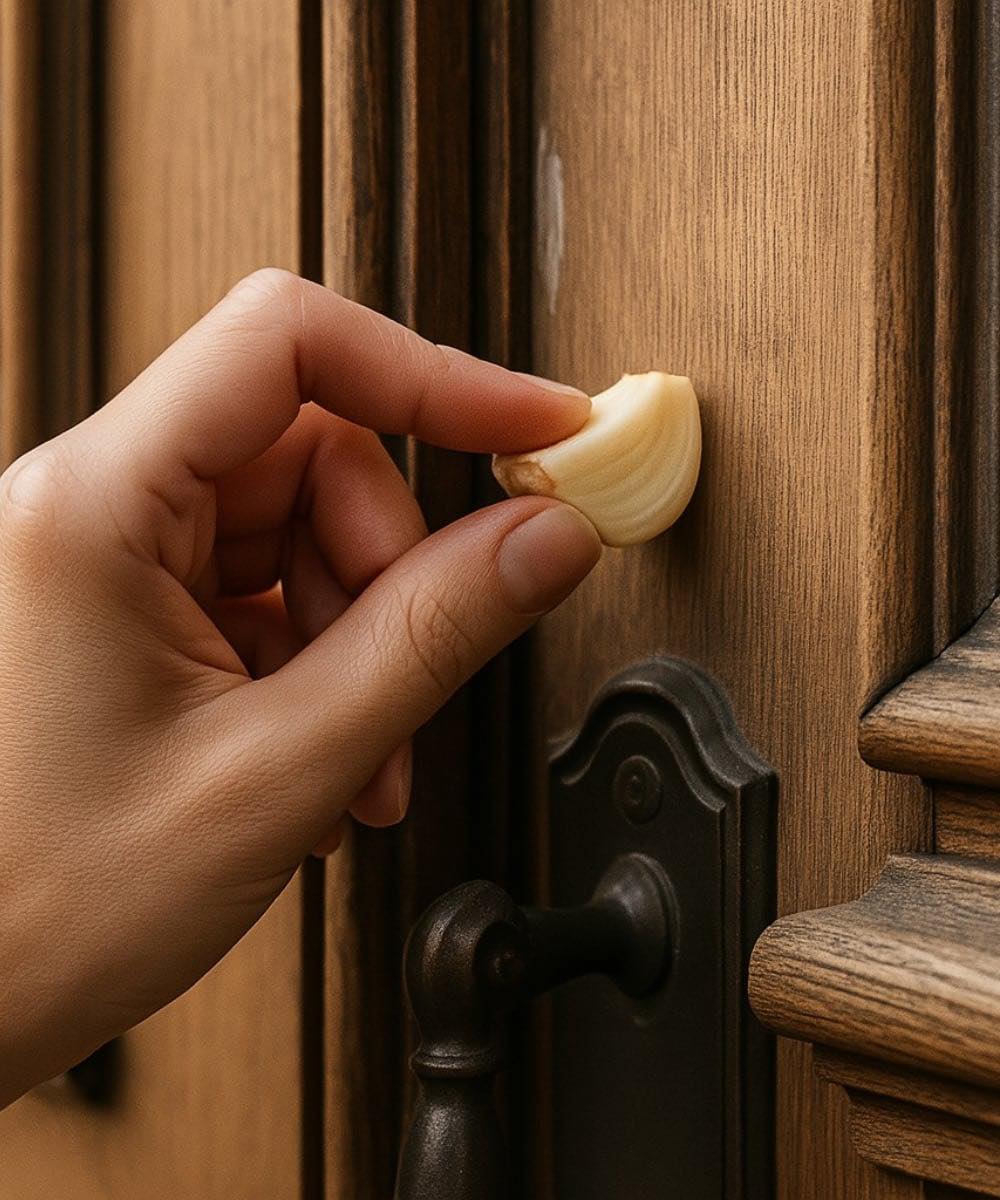 • Schälen Sie den Knoblauch und reiben Sie ihn direkt an den Innen- und Außenkanten des Türrahmens entlang.