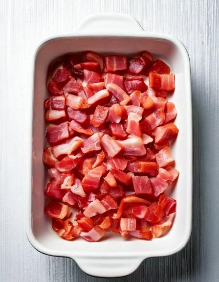 Rohen Speckwürfel in die Auflaufform geben. 5 Zutaten später: Frühstück zum Abendessen fertig