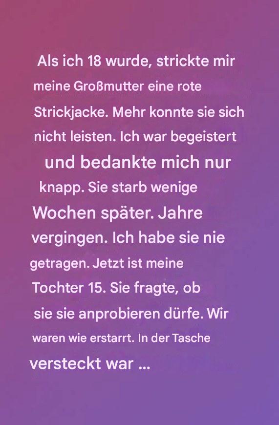 An meinem achtzehnten Geburtstag schenkte mir meine Großmutter eine in geblümtes Papier gewickelte Schachtel. Darin lag eine selbstgestrickte rote Strickjacke. Ich würdigte sie kaum eines Blickes. Ein kurzes „Danke“, ein Kuss auf die Wange, und schon war ich aus der Tür – voller Lachen, Autofahrten und nächtlichen Plänen. Mit achtzehn verstehe ich nicht, dass in jeder Masche Stunden ihre Liebe steckt.