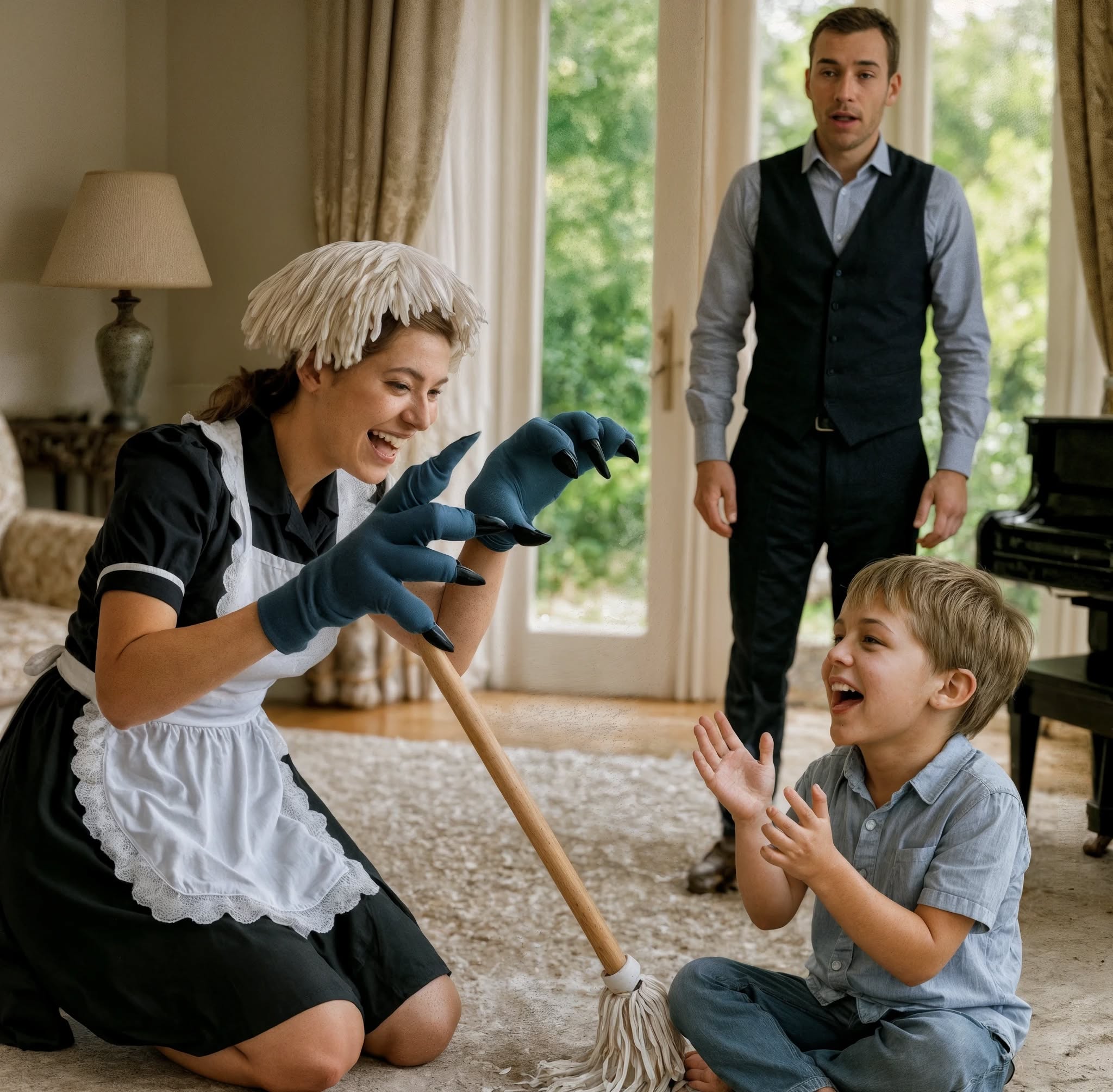 Als er in der Villa ankam, war kein Persönlicher da, um ihn zu begrüßen. Er hatte sie am Vortag mit einer Nachricht für den Nachmittag entlassen. Mit dem Spielzeug in der einen und dem Aktenkoffer in der anderen Hand schlich er durch die Hintertür, in der Hoffnung, Lucas zu überraschen. Doch was er im Flur sah, ließ ihn wie angewurzelt stehen bleiben. Mitten im großen Wohnzimmer stand Clara, das Dienstmädchen, und gab sich als brüllender Dinosaurier aus, mit einem Wischmopp wie eine Mähne auf dem Kopf. Lucas krümmte sich vor Lachen, Tränen der Freude in den Augen. Clara spielte nicht nur – sie schauspielerte. Sie knurrte, taumelte, brüllte erneut und brach dann wie ein besiegter Drache zusammen. Lucas kroch zu ihr und legte die Arme um ihren Hals.