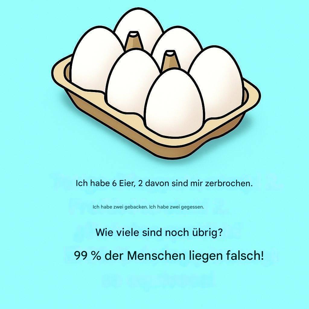 6 – 2 (kaputt) – 2 (kaputt) – 2 (opgegeten) = 0 eieren.