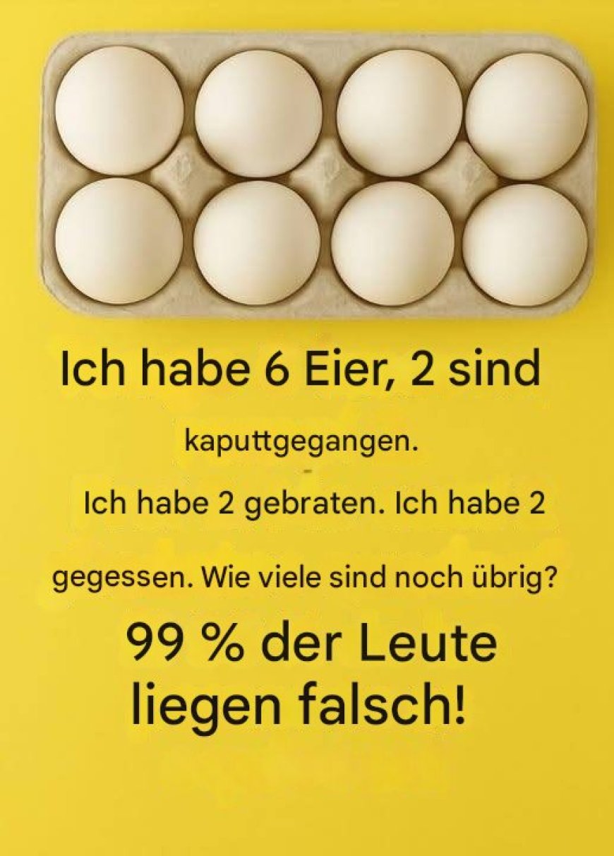 „Ich habe 6 Eier. 2 habe ich zerbrochen. 2 habe ich gebraten. 2 habe ich gegessen. Wie viele Eier habe ich noch übrig?“