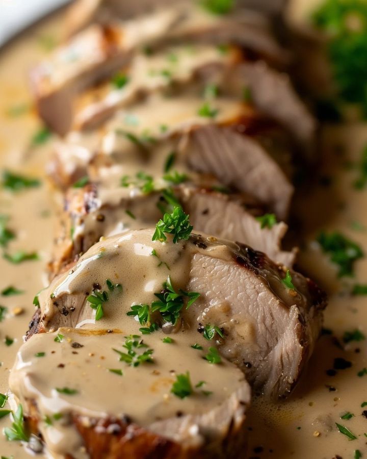 Traditionell werden französisch inspirierte Schweinefleischgerichte meist mit Wurzelgemüse oder Kartoffelgratin serviert. Um jedoch etwas Abwechslung zu schaffen, serviere ich dieses zarte Schweinefilet oft mit einem Bett aus Knoblauch-Blumenkohlpüree oder geröstetem Spargel. Das harmoniert nicht nur mit der cremigen Sauce, sondern verleiht dem Gericht auch einen Hauch Eleganz. Knuspriges Brot oder ein Reispilaf wirken zweifellos Wunder, um auch den letzten Tropfen der köstlichen Sauce aufzusaugen.